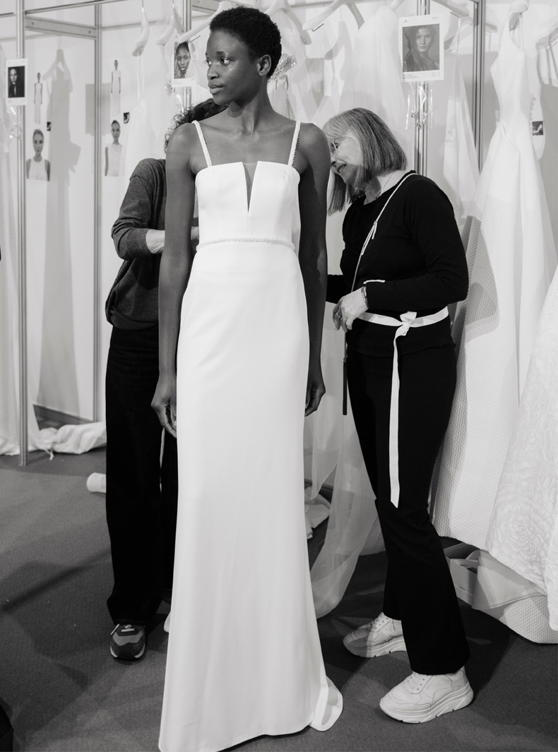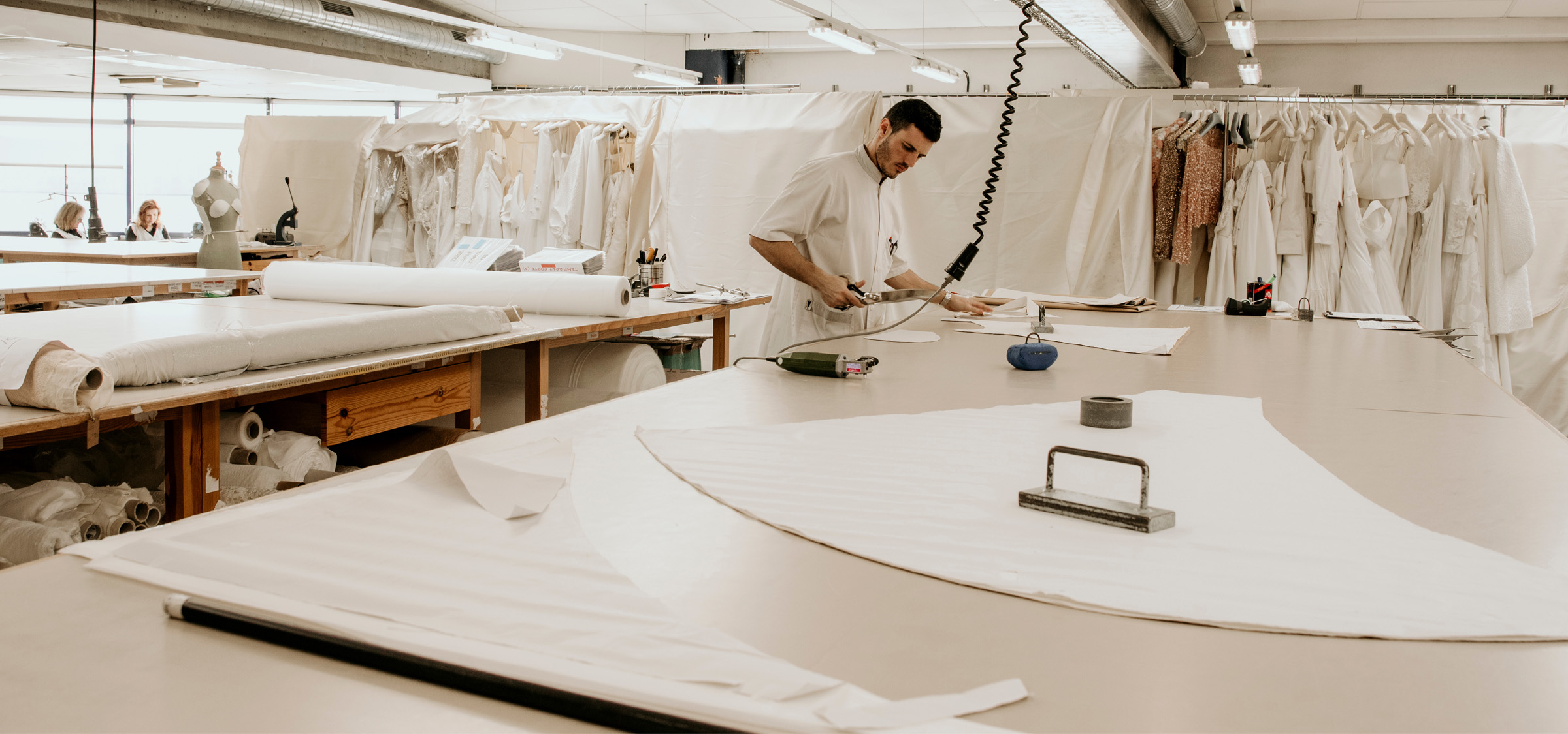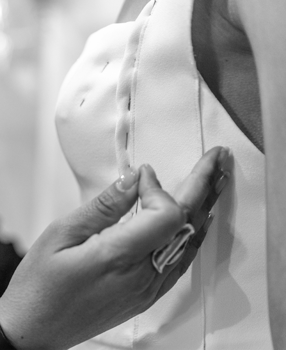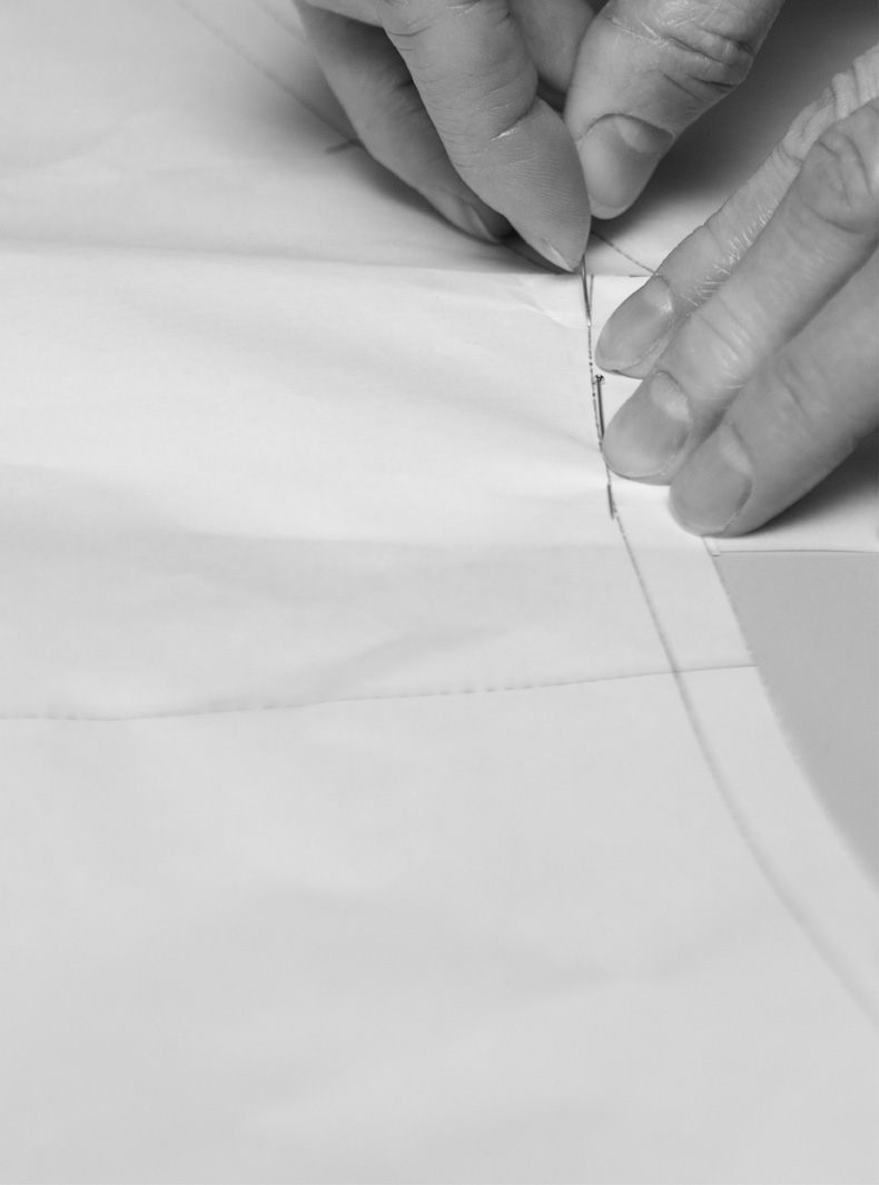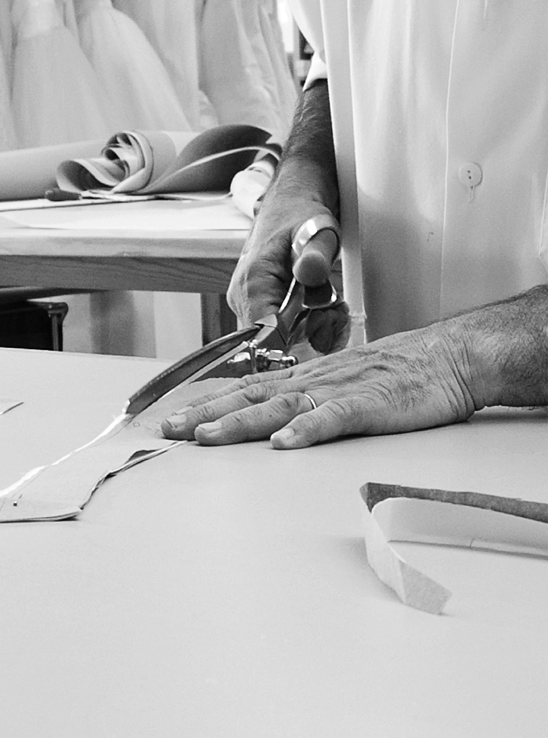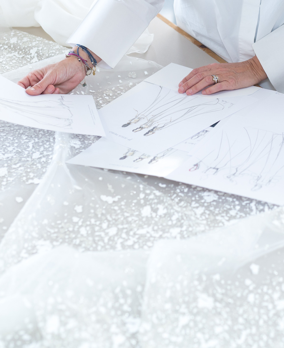 Jedes Kleid nimmt mit einem hochpräzisen Schnittmuster Form an, das mit digitaler Technologie entwickelt, aber stets von Hand perfektioniert wird. Die Schnittmuster werden gedruckt und an das Zuschneideteam weitergegeben, das mit millimetergenauer Präzision arbeitet, um einen perfekten Fall jedes Stoffes zu gewährleisten.