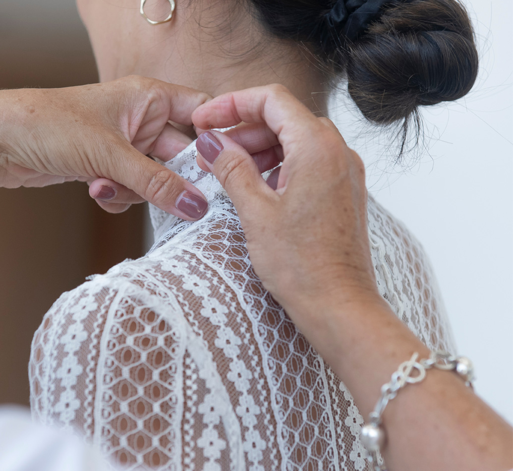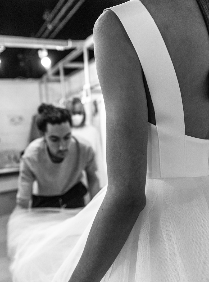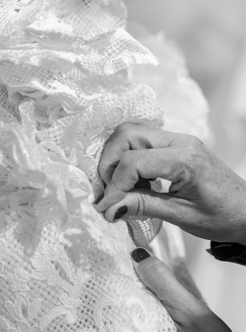 Erfahrene Schneiderinnen und Modistinnen erwecken jedes Design mit einer Liebe zum Detail zum Leben, die typisch für Haute Couture ist. Jedes Kleid wird in unserem Atelier in Barcelona sowie in Partnerwerkstätten in Spanien genäht, überprüft und angepasst. Es gibt keine Lagerbestände oder Massenproduktion – jedes Stück wird auf Bestellung gefertigt.