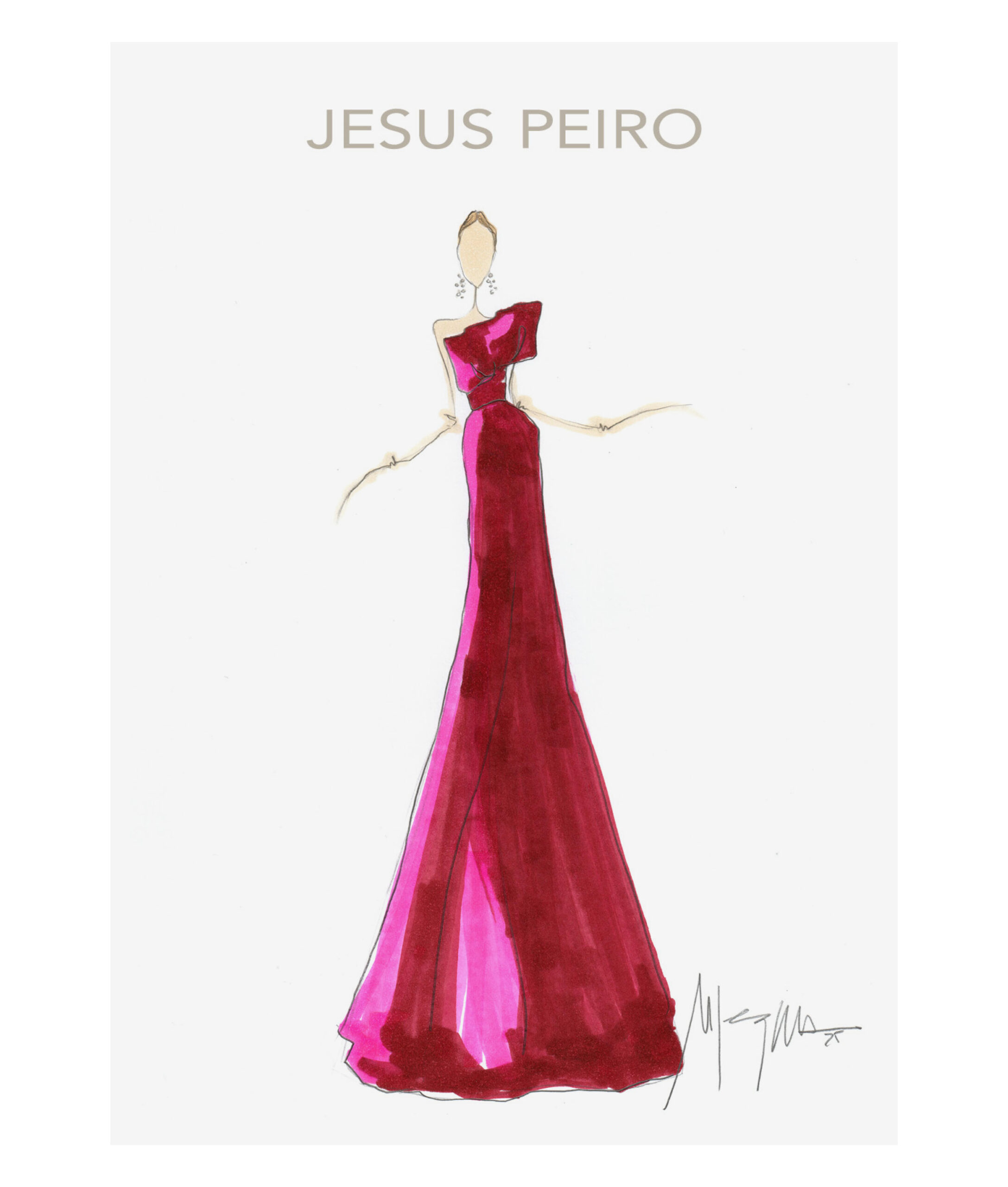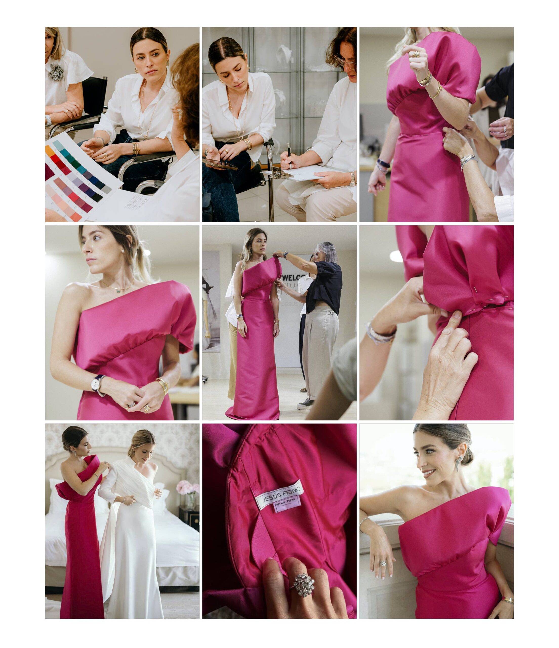 Der Prozess von Natalia war ebenso intensiv wie besonders. Bereits bei der ersten Anprobe begann ihr Abendkleid – entworfen von Merche Segarra by JESUS PEIRO – Gestalt anzunehmen: ein maßgefertigtes Modell aus Bougainvillea-Satin mit asymmetrischem Rüschenausschnitt, inspiriert von einem ikonischen Design von Jacqueline de Ribes, ausgestellt im MET in New York.
