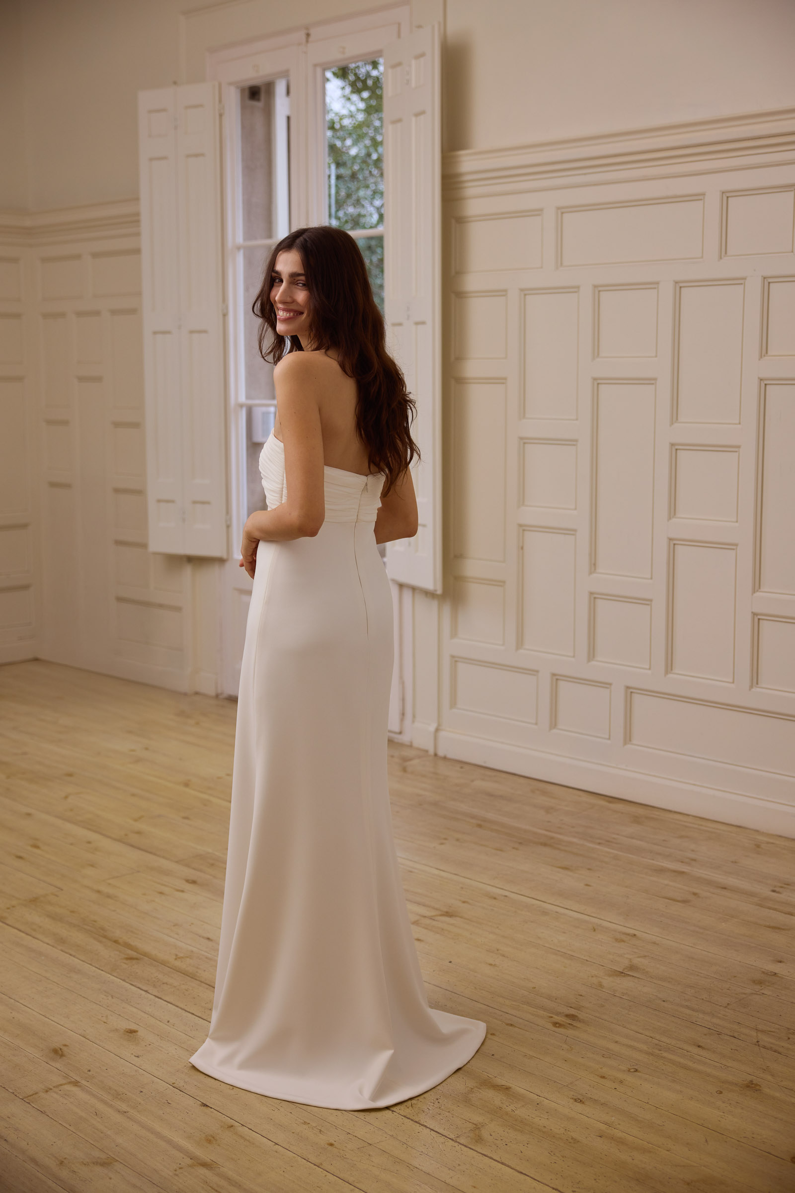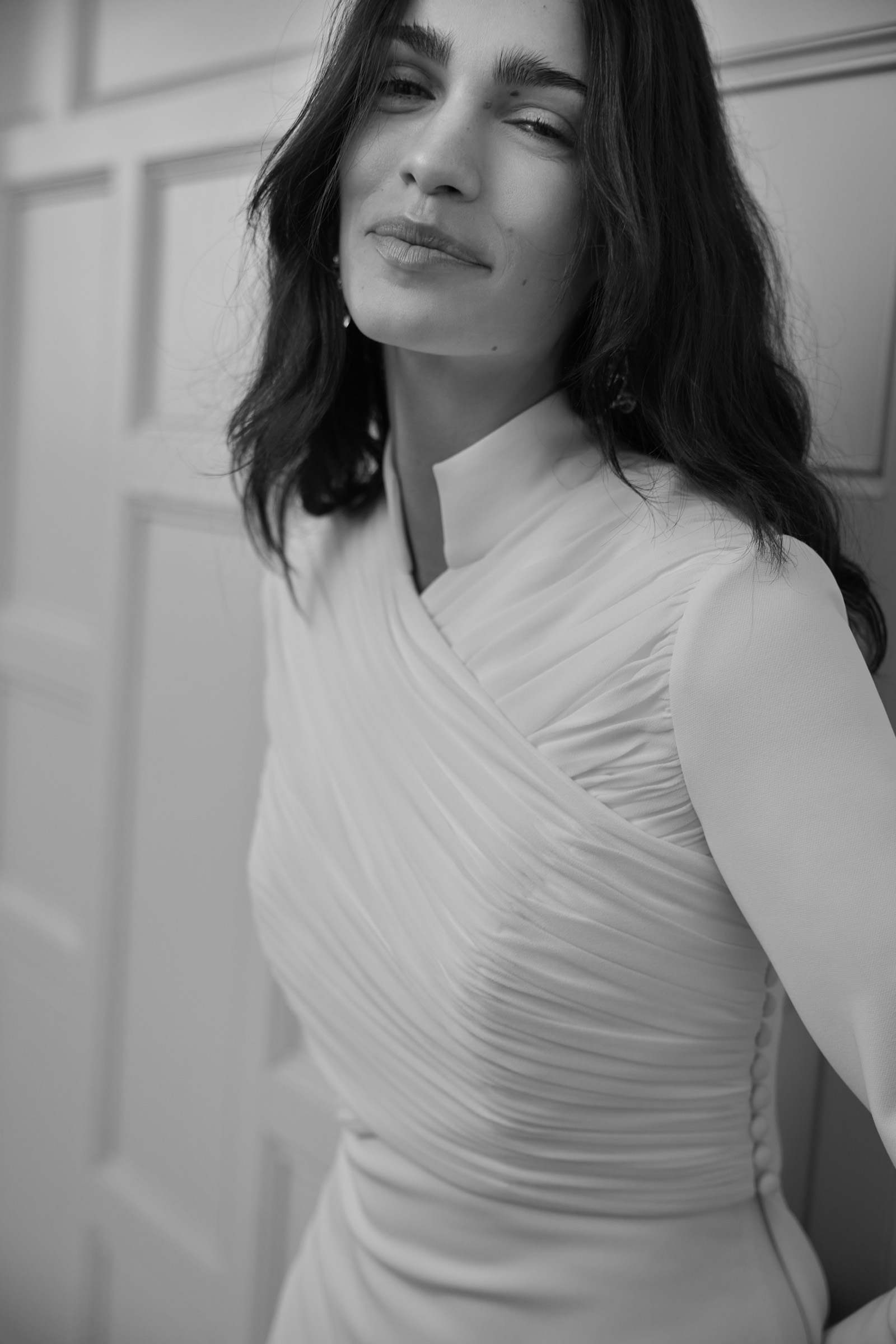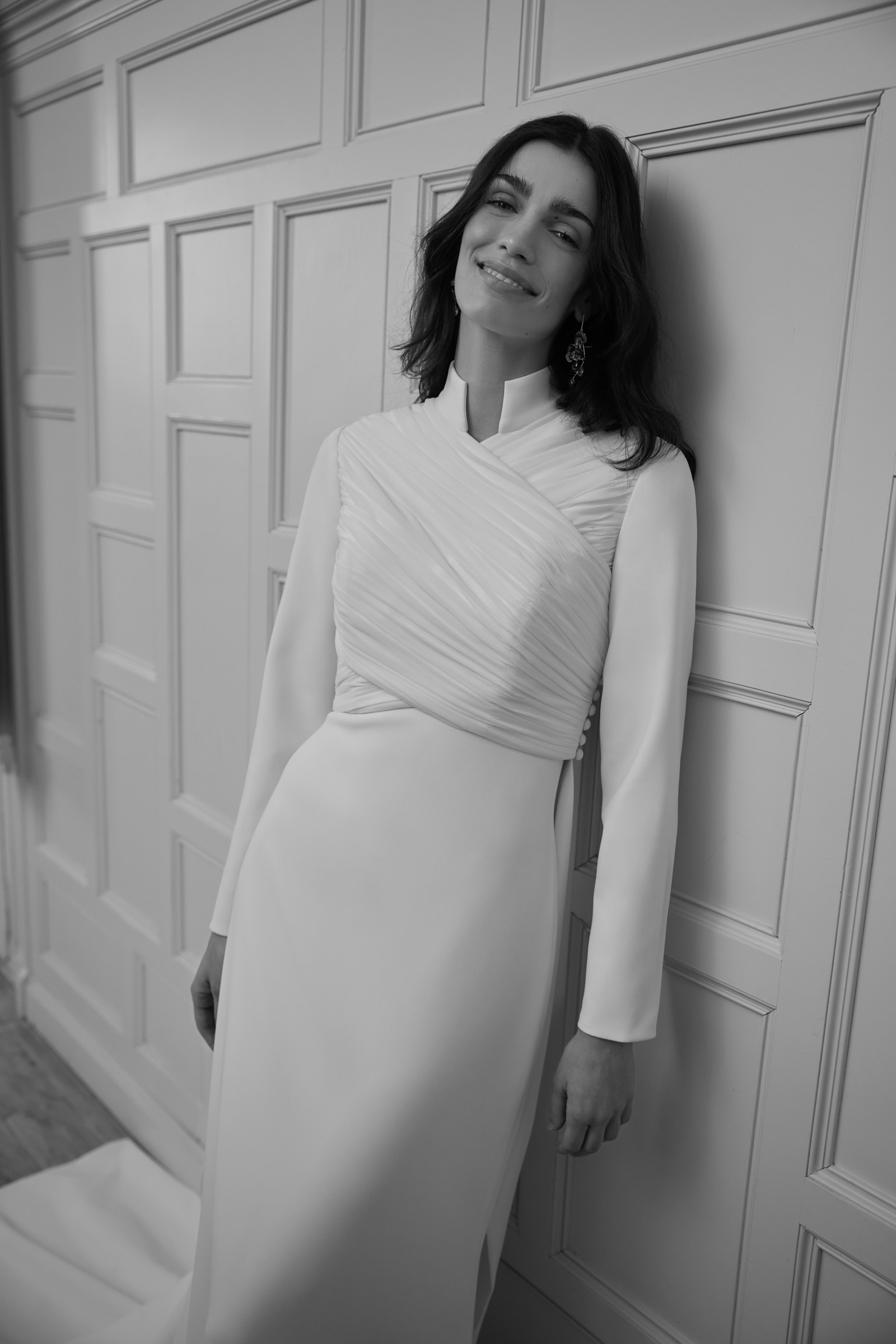 Cappotto e abito drappeggiato in chiffon e crepe.