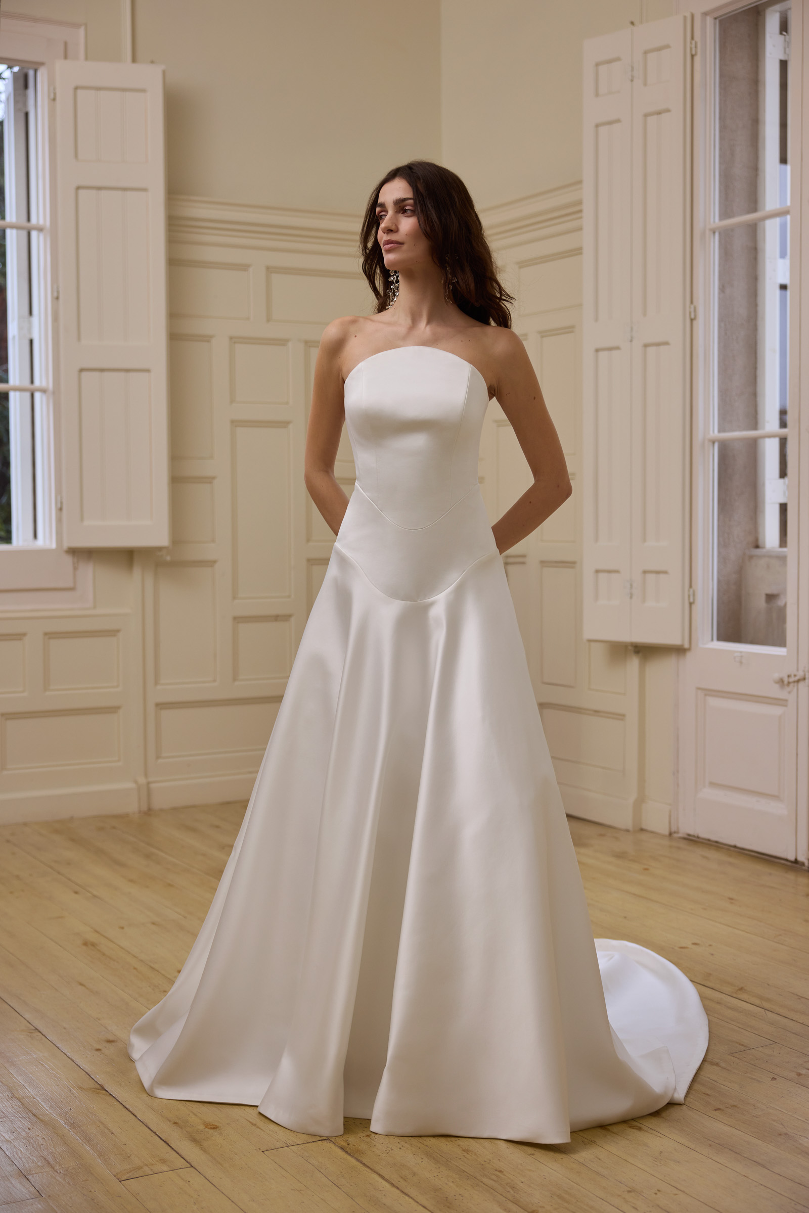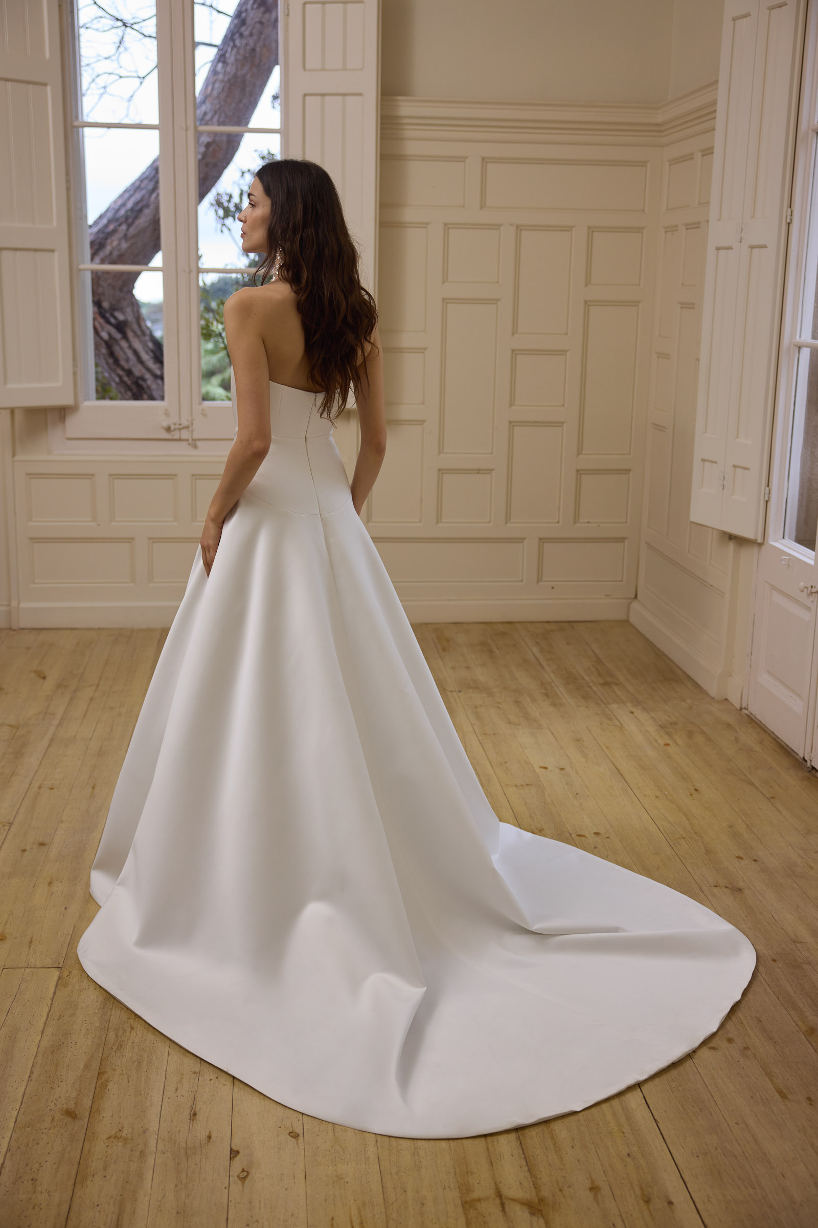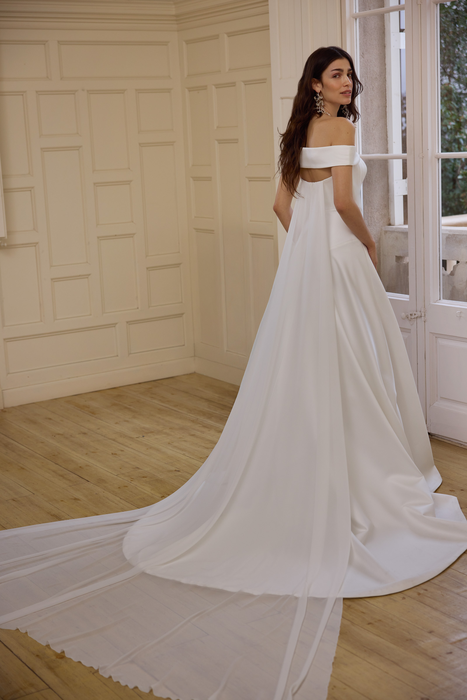 Scollo ovale e cut-away con mantella in raso e seta.