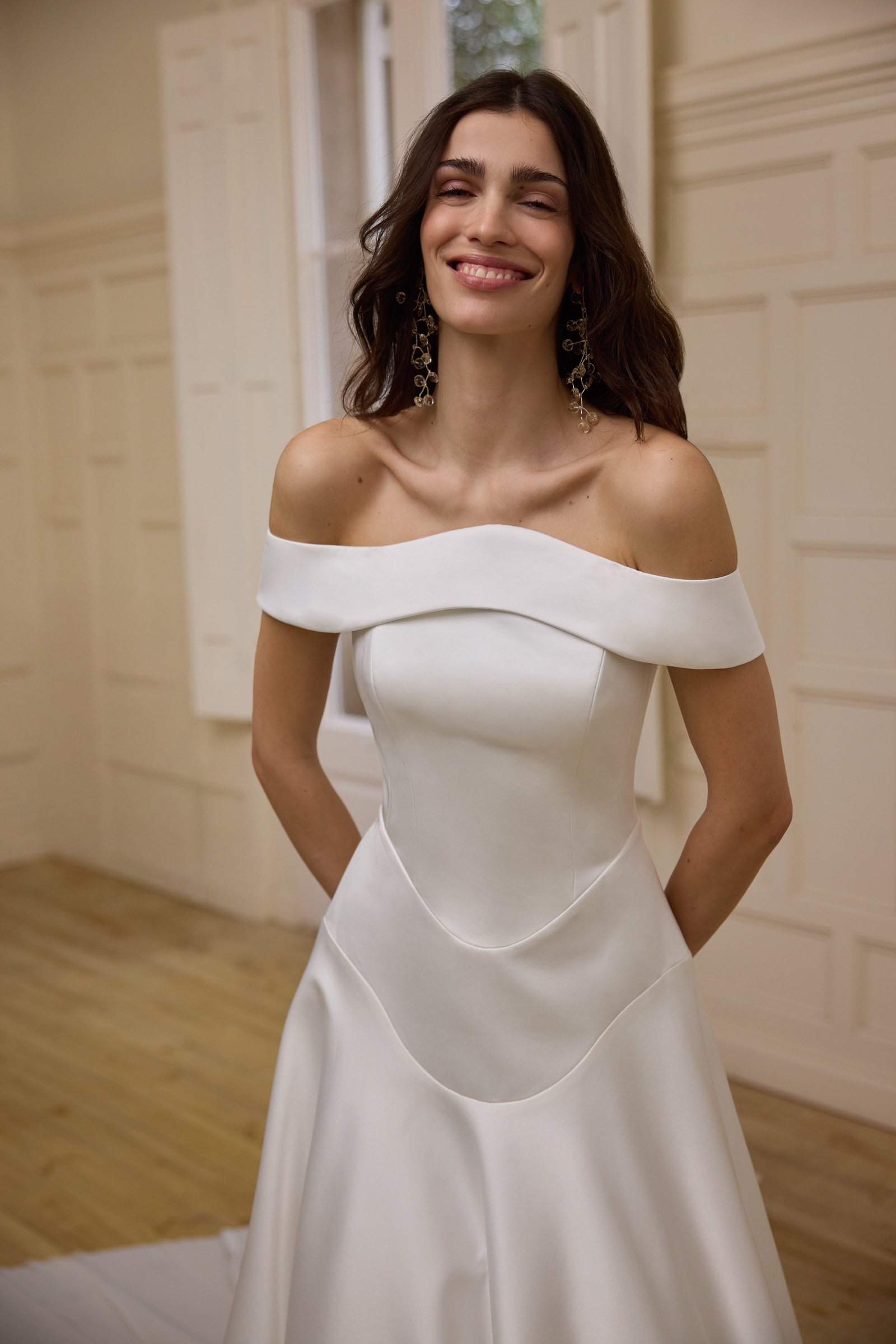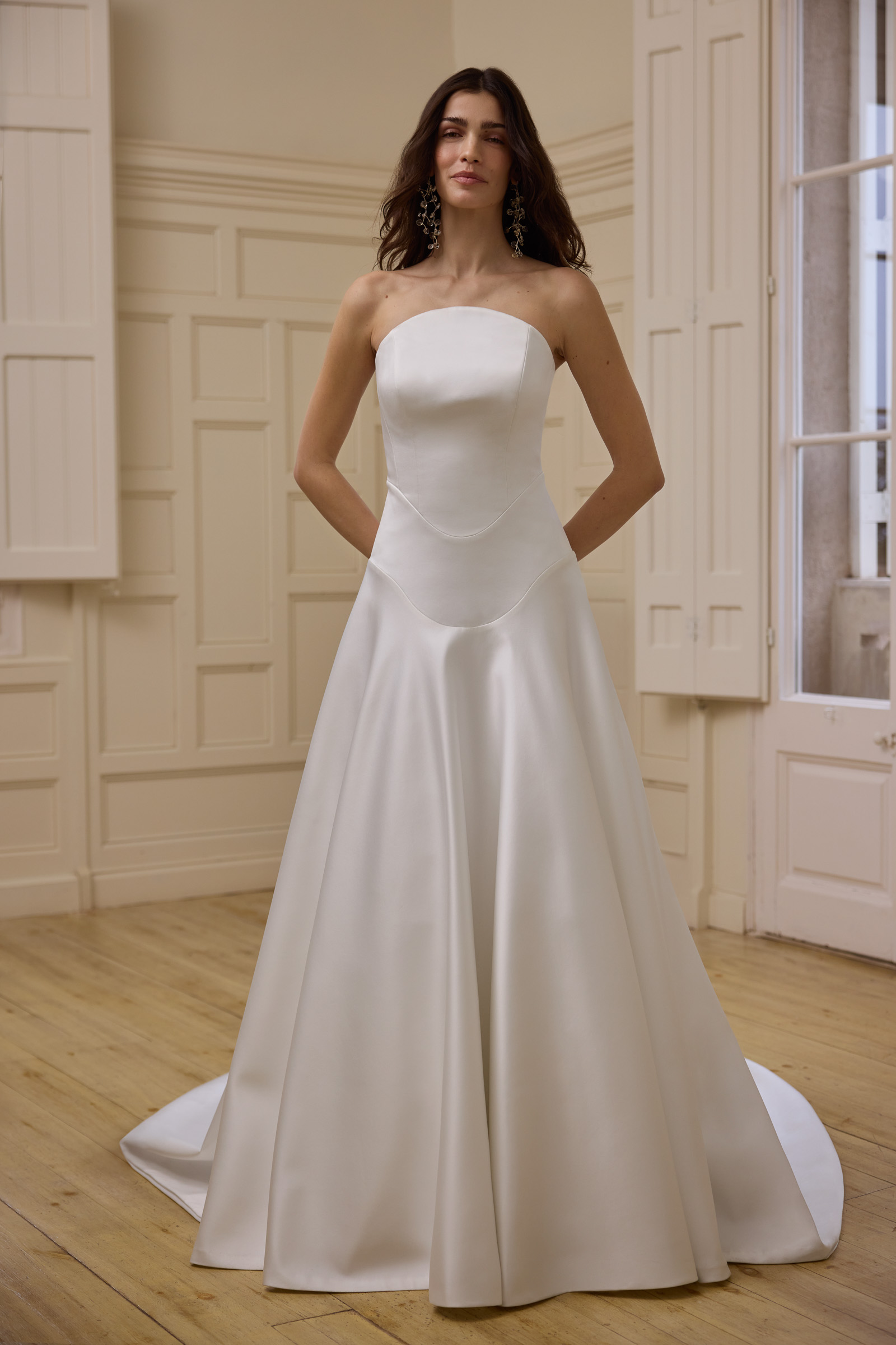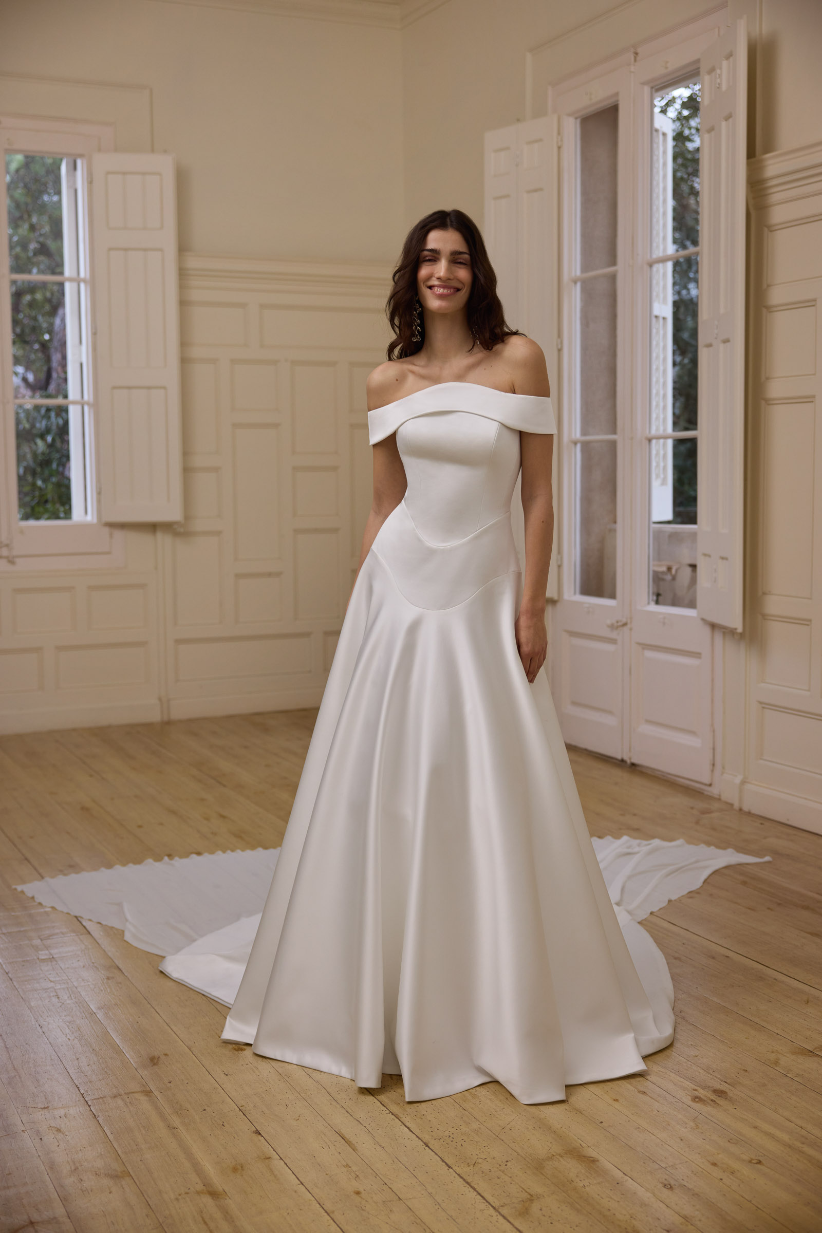 Scollo ovale e cut-away con mantella in raso e seta.